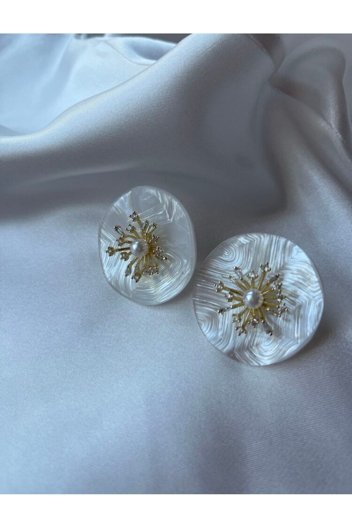 • Kategori: Kadın Küpe / Aksesuar • Renk: Beyaz & Altın • Malzeme: Reçine / Akrilik zemin + Metal Altın Detay + İnci • Boyut: Yaklaşık orta boy (ör.; 2.5–3.2 cm çap) • Kullanım: Günlük & özel gün…